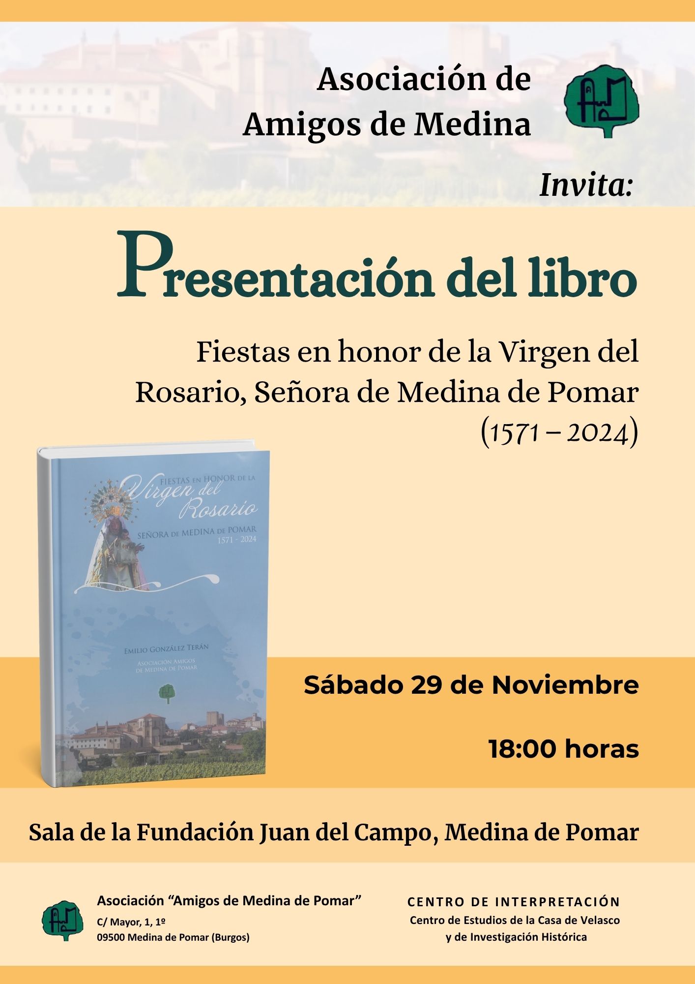 Bajo el título “Fiestas en honor a la Virgen del Rosario, señora de Medina de Pomar (1571-2024”, la Asociación de Amigos nos trae al recuerdo selección de estampas y crónicas de nuestras fiestas mayores. Una publicación de 490 páginas que cuenta con el mecenazgo de la Diputación Provincial, la autorización expresa de Diario de Burgos y de una decena de colaboradores que han ofrecido fotografías, carteles y programas.